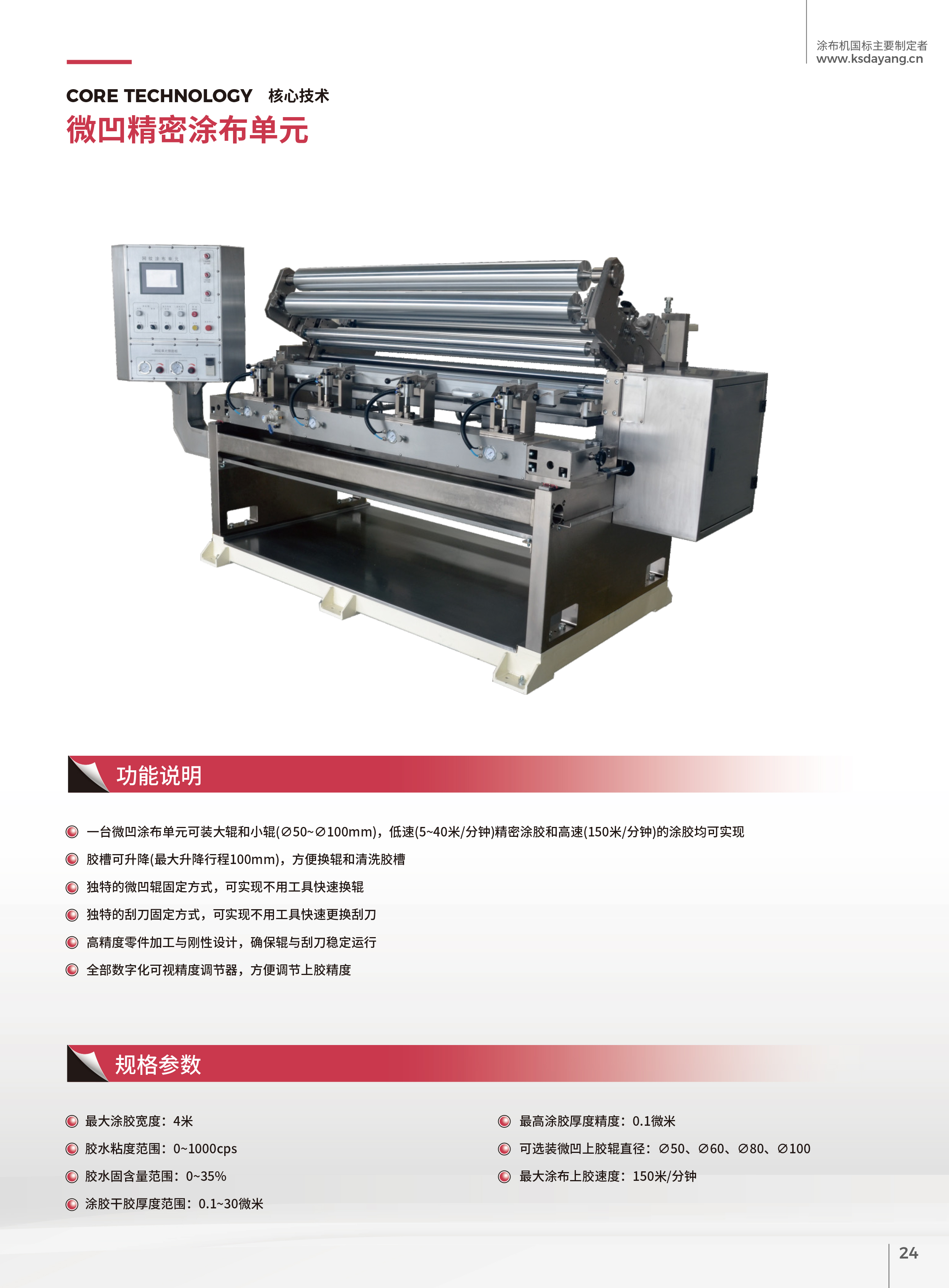 一臺微凹涂布單元可裝大輥和小輥(∅50~∅100mm),低速(5~40米/分鐘)精密涂膠和高速(150米/分鐘)的涂膠均可實現(xiàn)