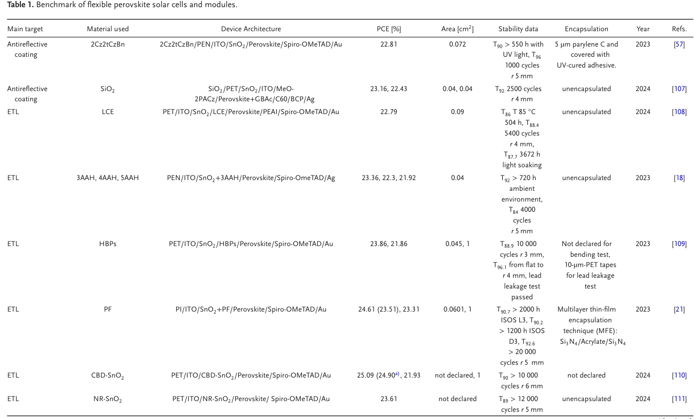 鈣鈦礦太陽(yáng)能技術(shù)取得了令人矚目的進(jìn)展,在短短的14年里從3.8%提高到了26.1%的能量轉(zhuǎn)換效率。最初在帶有透明導(dǎo)電氧化物(TCOs)涂層玻璃的剛性襯底上測(cè)試,鈣鈦礦的吸引力在于使用低溫工藝(< 150 °C)簡(jiǎn)化制備步驟。這使得柔性襯底如聚對(duì)苯二甲酸乙二醇酯(PET)和聚萘二甲酸乙二醇酯(PEN)的使用成為可能,在易加工性和耐用性之間提供了一個(gè)折中,從而獲得具有高功重比的輕量型器件。