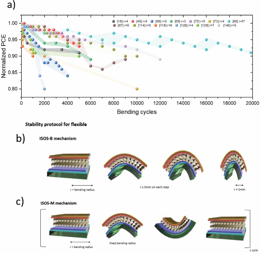 圖4. a)總結(jié)了截至202 419年11月,在研究領(lǐng)域中對(duì)柔性鈣鈦礦技術(shù)所取得的最佳結(jié)果進(jìn)行的力學(xué)測(cè)試,r代表以mm測(cè)量的彎曲半徑,進(jìn)行彎曲試驗(yàn),愈合步驟為1小時(shí),每2000次循環(huán);b) 提出了標(biāo)準(zhǔn)的ISOS-M機(jī)制,展示了一個(gè)力學(xué)測(cè)試周期,使柔性裝置從平面轉(zhuǎn)到固定彎曲位置,適用于凸起和凹陷兩種工況;c) 提出了標(biāo)準(zhǔn)的ISOS-B機(jī)制,使柔性器件從平面上升到1 mm的彎曲半徑。