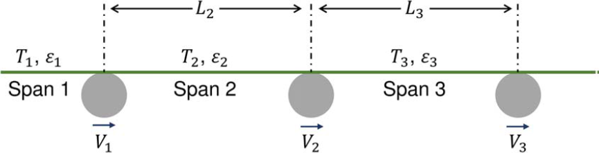 圖2 多跨段卷對卷(R2R)生產(chǎn)線中的應變傳輸(Ti和εi分別表示第i個卷材跨段的卷材張力和應變,Vi表示第i個跨段末端的卷材縱向速度,Li表示第i個跨段的長度,其中i=1–3)02
