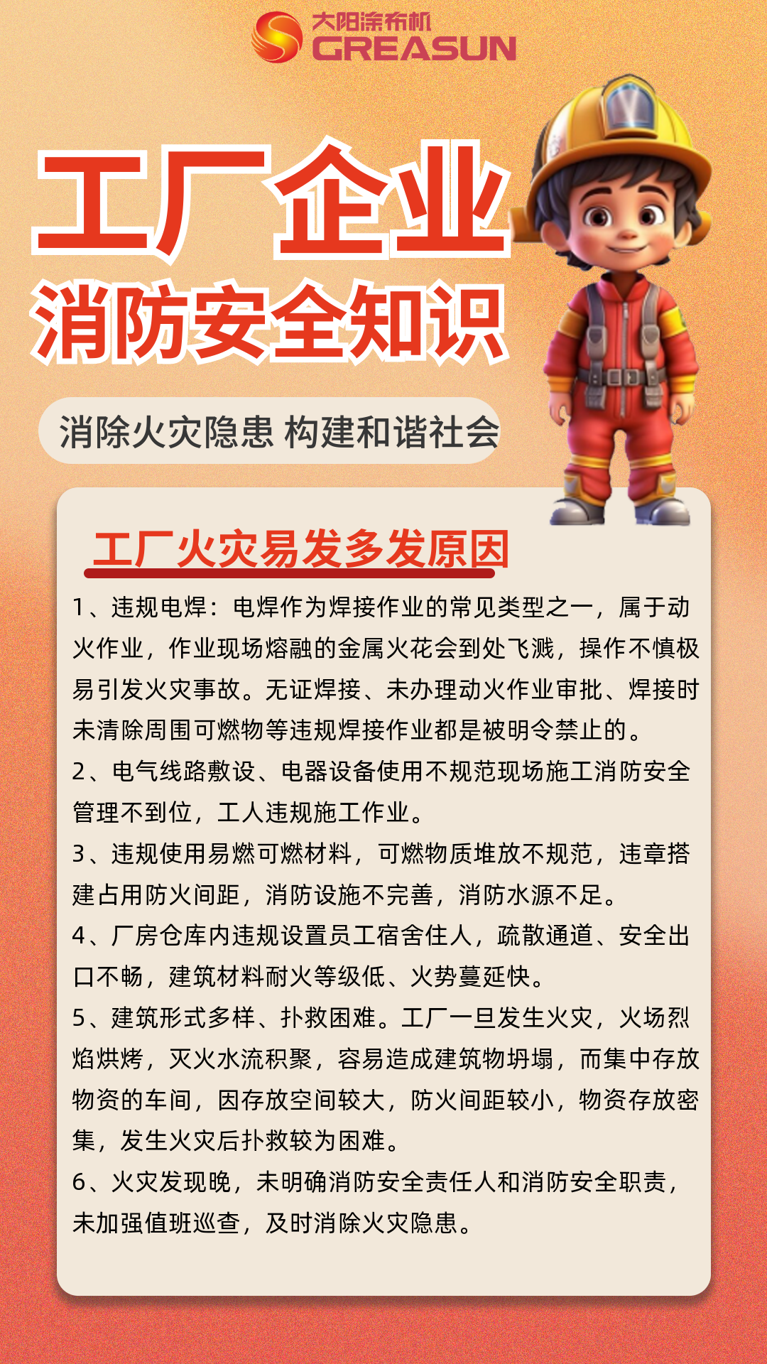 我們除了要做好森林、居民家庭防火,還要做好工廠企業(yè)防火。工廠內(nèi)人員密集、用電量大、易燃可燃物多,一個(gè)疏忽大意,極易在生產(chǎn)過程中發(fā)生火災(zāi)事故對(duì)廠內(nèi)員工的人身安全和工廠財(cái)產(chǎn)安全都會(huì)造成嚴(yán)重威脅。造成工廠火災(zāi)易發(fā)多發(fā)的原因有哪些?應(yīng)該如何預(yù)防工廠火災(zāi)?如果不幸遇到火災(zāi)又該如何自救逃生?