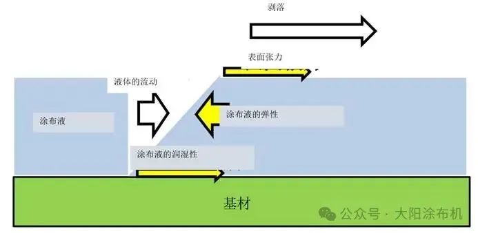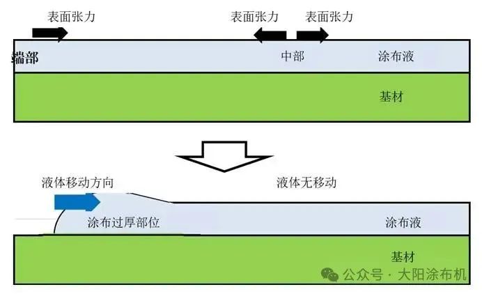 涂布面中心部位因表面張力作用導(dǎo)致涂布液向左右兩側(cè)擴(kuò)散,而端部涂布液受表面張力單向牽引(僅向右),引發(fā)液體向右側(cè)遷移并形成局部增厚區(qū)域。