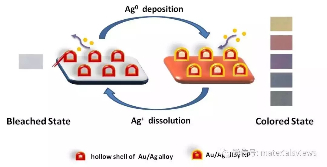 這種穩(wěn)定性來(lái)自于研究人員在ITO表面預(yù)先設(shè)計(jì)的一種中空的金銀合金納米結(jié)構(gòu),它可以像錨點(diǎn)一樣為銀原子的沉積進(jìn)行定位,避免了在反復(fù)著色和褪色過(guò)程中的薄膜循環(huán)性能下降。