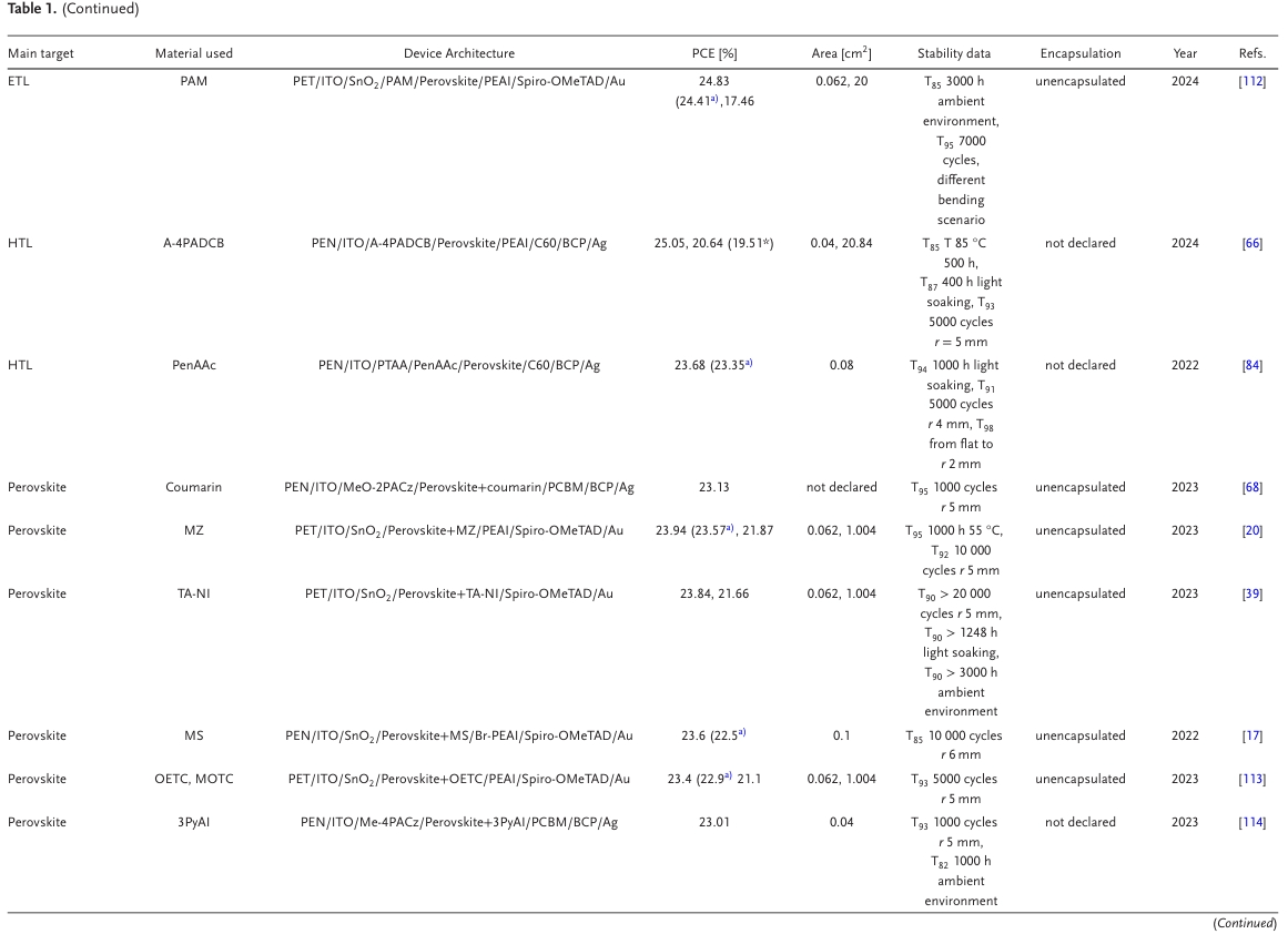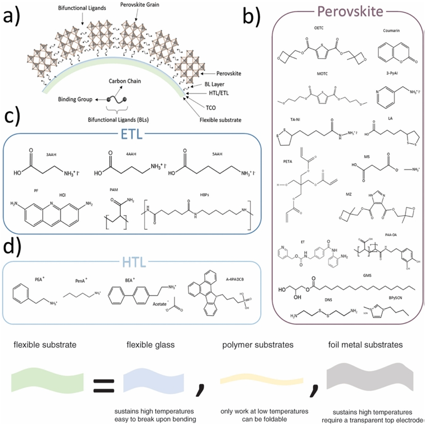 圖1. 在鈣鈦礦墨水中引入雙功能添加劑的機(jī)制,通過避免柔性鈣鈦礦太陽(yáng)能技術(shù)彎曲和扭曲過程中活性層薄膜的分層和開裂問題,引入強(qiáng)結(jié)合基團(tuán)的短雙官能團(tuán)來改善晶界鈍化和界面增韌;針對(duì)ETL、HTL和鈣鈦礦層的柔性鈣鈦礦太陽(yáng)能電池(f-PSCs)功率轉(zhuǎn)換效率(PCE)>23%的材料總結(jié)。