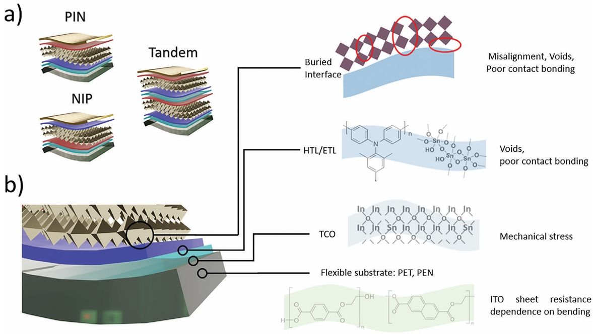 圖2. a) 用于柔性鈣鈦礦太陽(yáng)能技術(shù)的器件結(jié)構(gòu):PIN,NIP和疊層器件結(jié)構(gòu)。b) 重點(diǎn)研究的主要問題是解決限制剛性和柔性襯底之間的差距:柔性襯底的選擇,柔性襯底和TCO之間的接觸,其中ITO的方塊電阻通過襯底彎曲來改變;TCO與HTL ETL之間的接觸,主要問題集中在孔洞的存在以及這些層之間的接觸結(jié)合較差;HTL/ETL與鈣鈦礦之間的接觸(埋底界面),鈣鈦礦層可能會(huì)錯(cuò)位,產(chǎn)生孔洞,并且在HTL / ETL下面的HTL / ETL中具有較差的接觸結(jié)合。