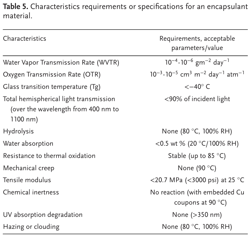 7. 封裝作者認(rèn)為封裝是保證太陽(yáng)能電池壽命、效率和安全性的關(guān)鍵步驟,特別是隨著對(duì)柔性襯底太陽(yáng)能電池的關(guān)注越來越多。柔性模組需要封裝材料在保持柔韌性的同時(shí),對(duì)水分、氧氣和機(jī)械應(yīng)力提供堅(jiān)固的保護(hù)。相比之下,剛性模組使用封裝材料,如乙烯-醋酸乙烯酯(EVA),它提供了優(yōu)異的保護(hù),但缺乏靈活性。對(duì)于柔性模組,薄膜封裝、柔性層壓等先進(jìn)的封裝方法必不可少。柔性鈣鈦礦模塊的封裝通常使用柔性聚合物(例如,聚烯烴、聚氨酯等)和多層阻擋層薄膜等材料。這些材料必須提供低的水蒸氣透過率(WVTR)和氧氣透過率(OTR)來保護(hù)敏感的鈣鈦礦層。例如,聚烯烴等柔性封裝材料可以提供低至0.01 g / m2/day的WVTR值,這對(duì)于保持器件性能和穩(wěn)定性至關(guān)重要。在柔性PSC生產(chǎn)中常見的卷對(duì)卷工藝,需要在很長(zhǎng)的長(zhǎng)度上均勻地沉積封裝層,以實(shí)現(xiàn)一致的保護(hù)。高性能的阻隔膜對(duì)長(zhǎng)期穩(wěn)定性至關(guān)重要,水蒸氣和氧氣透過率(WVTRs和OTRs)是關(guān)鍵指標(biāo)。鈣鈦礦太陽(yáng)能技術(shù)要求WVTR或OTR的阻隔性能反映了這些器件對(duì)水分和氧氣(表5 ,圖5a)的敏感性。實(shí)現(xiàn)如此嚴(yán)苛的阻隔性能對(duì)阻隔薄膜的初始制備和批量生產(chǎn)都提出了挑戰(zhàn)。表5. 封裝材料的特性要求或規(guī)范。