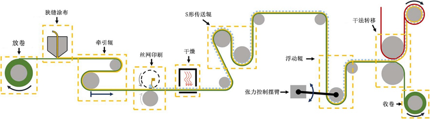 R2R系統(tǒng)以柔性基材(卷材)為核心,從放卷裝置開始,依次經(jīng)過狹縫式涂布器、絲網(wǎng)印刷機、加熱干燥裝置,最終通過干法轉移將印刷圖案轉移至目標基材,如圖1所示。此過程中,牽引輥、S形傳送輥和浮動輥等累加器組件精確控制卷材的張力和速度,確保生產(chǎn)過程的穩(wěn)定性和連續(xù)性。