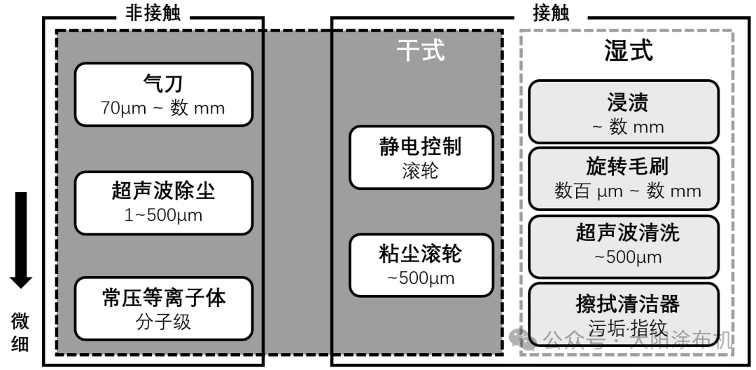 氣刀除塵法通過(guò)噴射高壓空氣剝離基材表面異物,并由真空系統(tǒng)同步回收去除的污染物。但其有效性受限于空氣阻力,氣流在距離薄膜表面數(shù)十微米處顯著衰減,導(dǎo)致邊界層內(nèi)微小異物的剝離力急劇下降(因風(fēng)力減弱無(wú)法將異物卷?yè)P(yáng)至紊流層),故難以清除此類微粒。