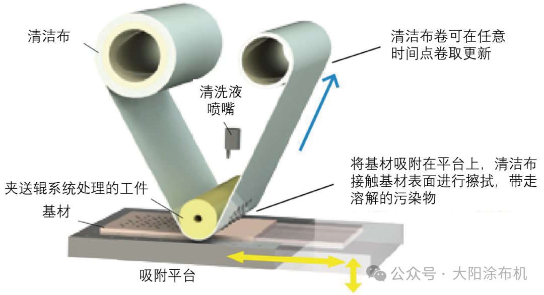 適用于去除殘留在基材表面的油類、墨水、膠水、皮脂污漬等粘附性頑固異物。將溶劑或清洗液浸潤(rùn)在清潔布卷上,通過(guò)卷對(duì)卷方式輸送清潔布,同時(shí)用該布擦拭基材以去除污垢。擦拭下來(lái)的污垢隨著清潔布的卷取被隨時(shí)排出,從而防止二次污染。
