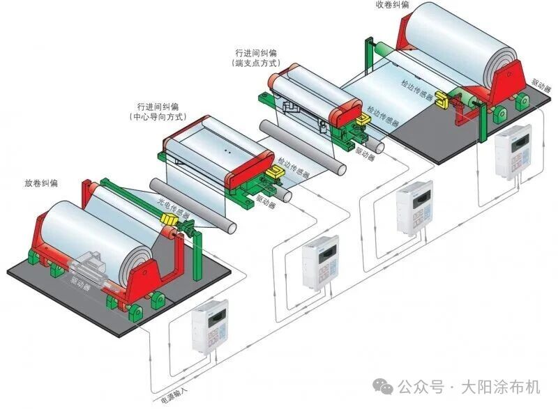 在涂布生產(chǎn)線上,基材經(jīng)歷放卷、涂布、干燥、復(fù)合、牽引和收卷等多道工序時,常因設(shè)備、材料或工藝參數(shù)等因素發(fā)生位置偏移。為確保涂布質(zhì)量與收卷整齊等工藝要求,必須對運(yùn)行基材的松緊度和位置偏移進(jìn)行實(shí)時糾正。其中,糾正基材橫向位置波動的系統(tǒng)稱為糾偏系統(tǒng);控制基材縱向張力穩(wěn)定的系統(tǒng)則為張力控制系統(tǒng)。兩者協(xié)同工作,共同保障生產(chǎn)過程的穩(wěn)定與產(chǎn)品的高質(zhì)量。